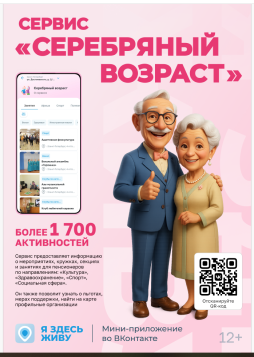 Ваш персональный гид по активной жизни в городе. Как подобрать досуг: 1. Откройте мини-приложение «Я здесь живу». 2. Укажите адрес вашего дома в разделе «Профиль». 3. Перейдите в сервис «Серебряный возраст» и выбирайте. vk.com/mesto#pensioners.